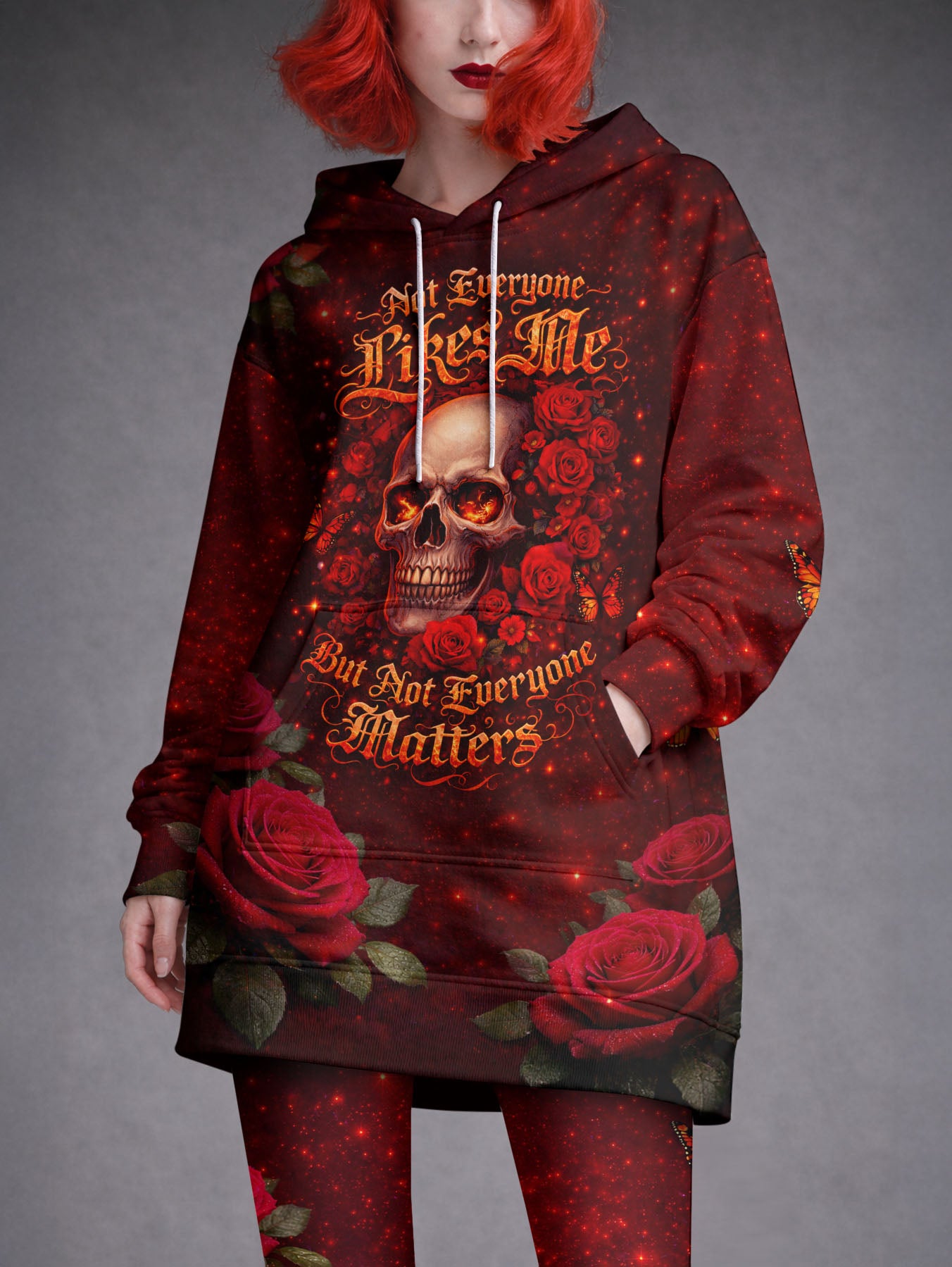 You spent years seeking approval from people who didn't deserve a vote. That ended. Blood-red truth wrapped around bone-wisdom: not everyone's opinion carries weight. Roses bloom for those who earned proximity. Butterflies scatter the rest. Your worth isn't a democracy—it's a monarchy, and you're the only one holding the crown. Stop campaigning. Start reigning. Matching leggings included. Complete the empire.